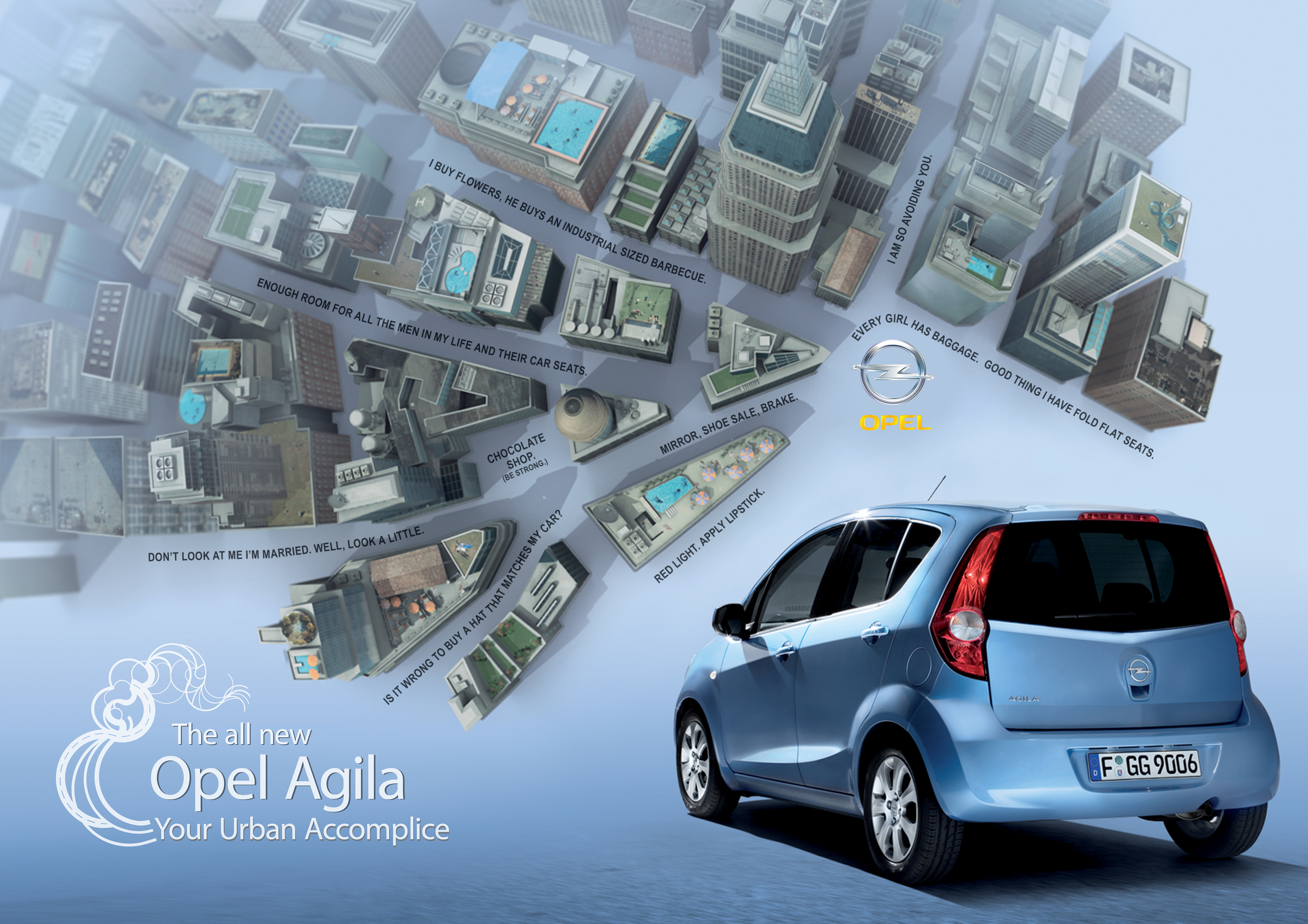 The all-new Opel Agila was targeted primarily to a young female Pan-European audience. These woman are not looking for a car that defines their personality, as much as a reliable vehicle that appeals to their modern sense of style, confidence, and desire for urban adventure. The Agila’s energetic performance and interior adaptability make it the perfect match and a true urban accomplice.