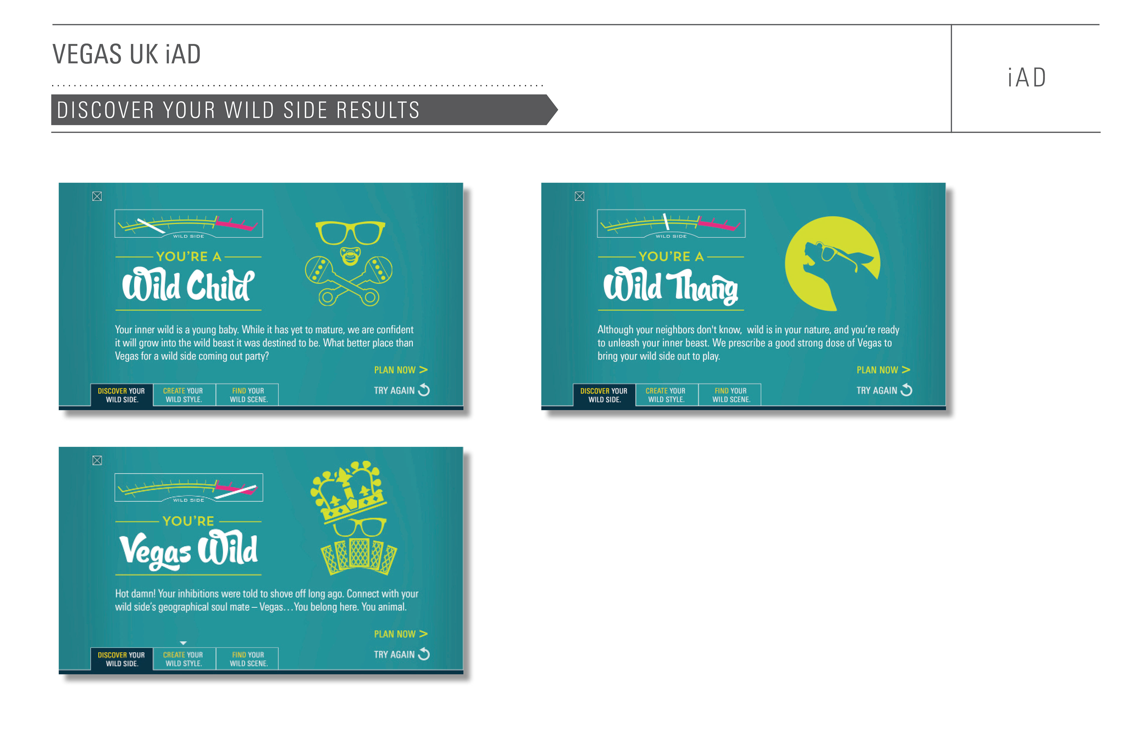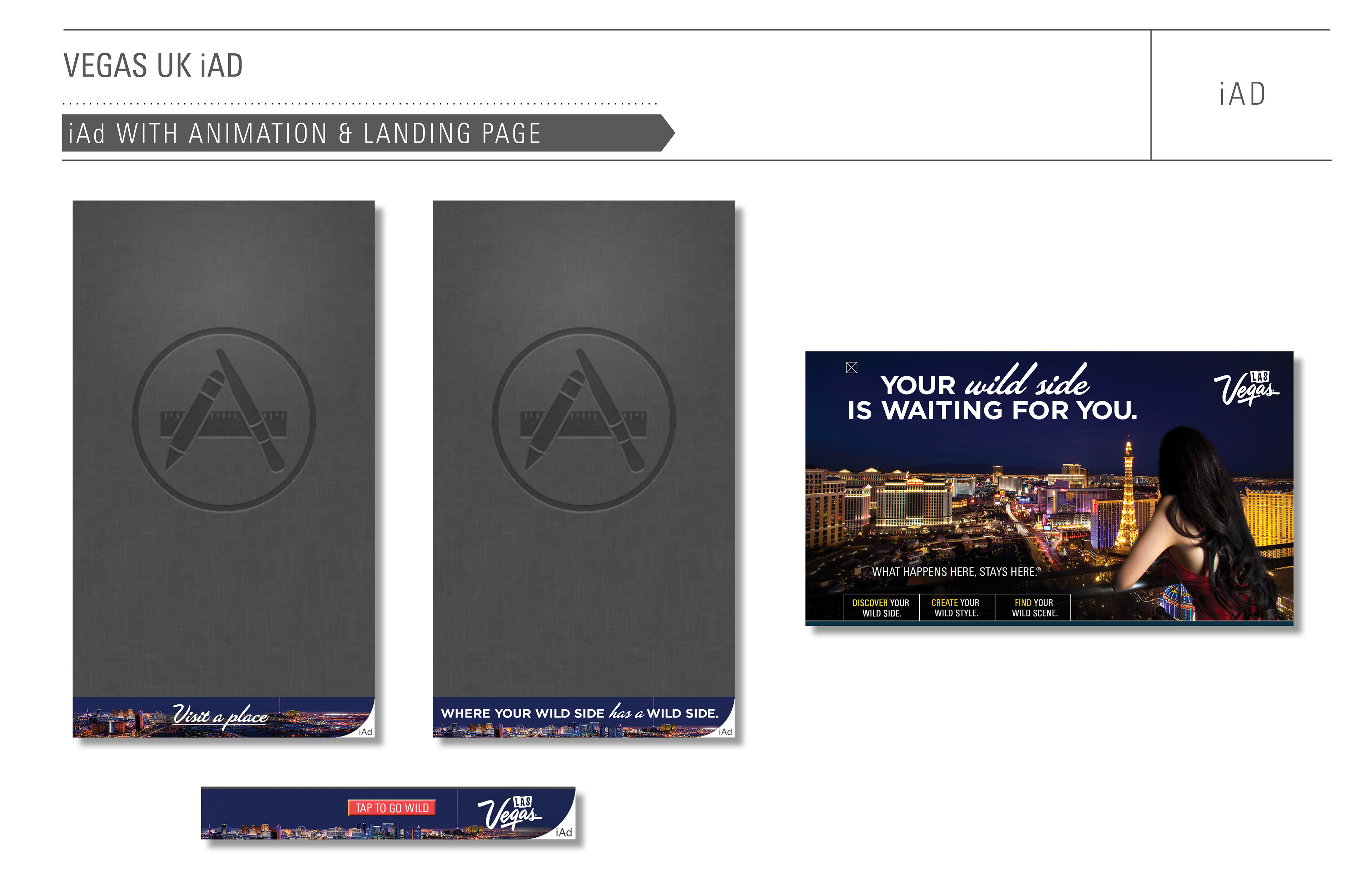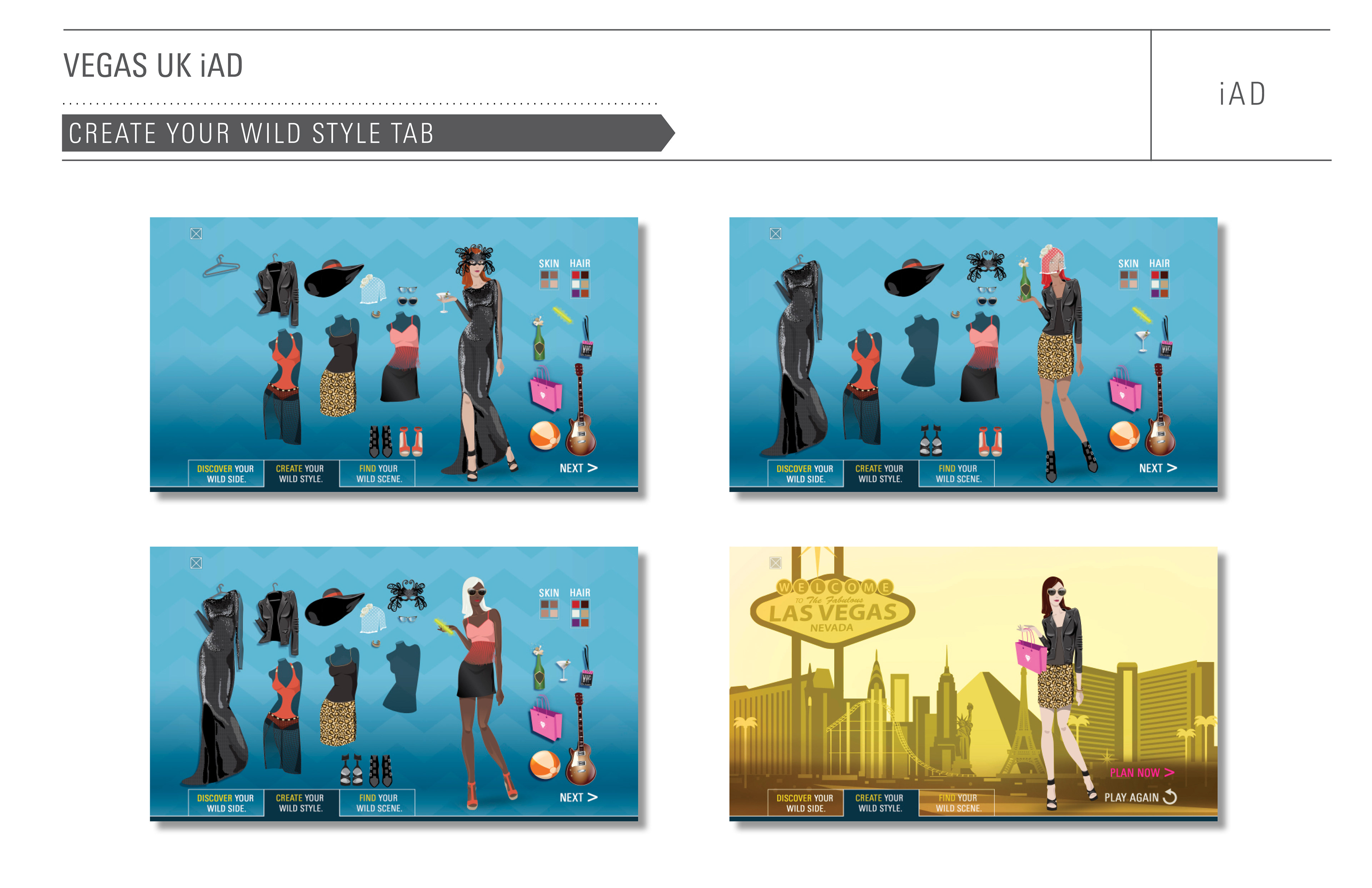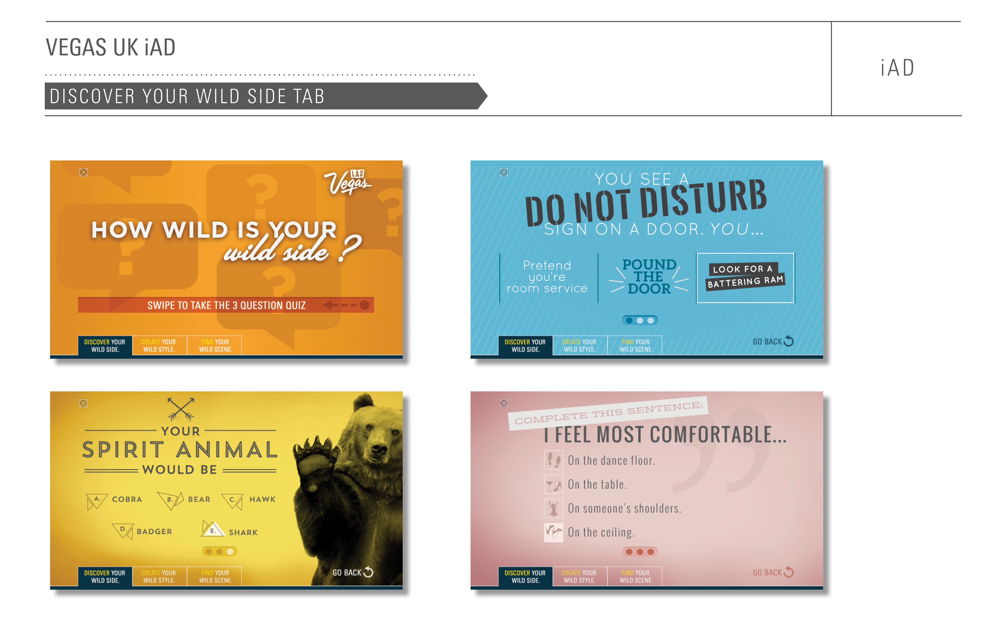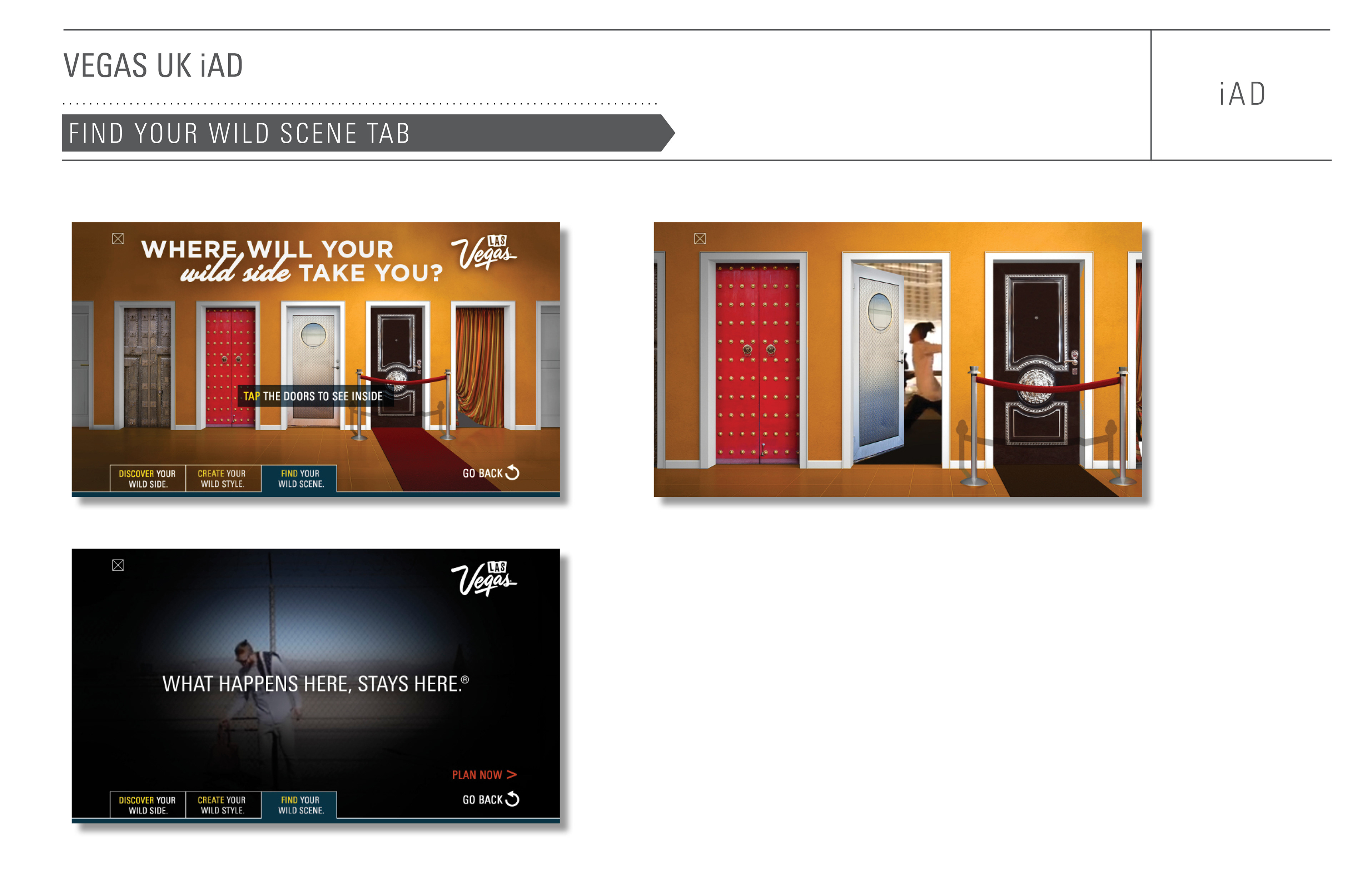 The Brits are even more of a mobile society than we are here in the U.S. In order to reach them while they’re on the move, we created this interactive iAd that encourages users to "visit a place where their wild side has a wild side". They can take a questionnaire to determine just how wild they really are, or look behind their chosen door to find out what wild scene they could encounter. We would then surprise and delight them with a :03 - :06 Vine video. And finally they were able to create an animated Vegas appropriate outfit that could be shared out on social media. The idea was to allow the user to experience a little bit of Vegas while they were still on their side the pond.